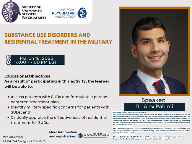 In support of improving patient care, this activity has been planned and implemented by American Psychiatric Association (APA) and Society of Uniformed Services Psychiatrists. The American Psychiatric Association (APA) is jointly accredited by the Accreditation Council for Continuing Medical Education (ACCME), the Accreditation Council for Pharmacy Education (ACPE), and the American Nurses Credentialing Center (ANCC), to provide continuing education for the healthcare team.