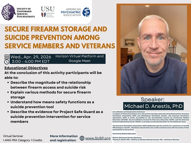 In support of improving patient care, this activity has been planned and implemented by American Psychiatric Association (APA) and the Society of Uniformed Services Psychiatrists. The American Psychiatric Association (APA) is jointly accredited by the Accreditation Council for Continuing Medical Education (ACCME), the Accreditation Council for Pharmacy Education (ACPE), and the American Nurses Credentialing Center (ANCC), to provide continuing education for the healthcare team.